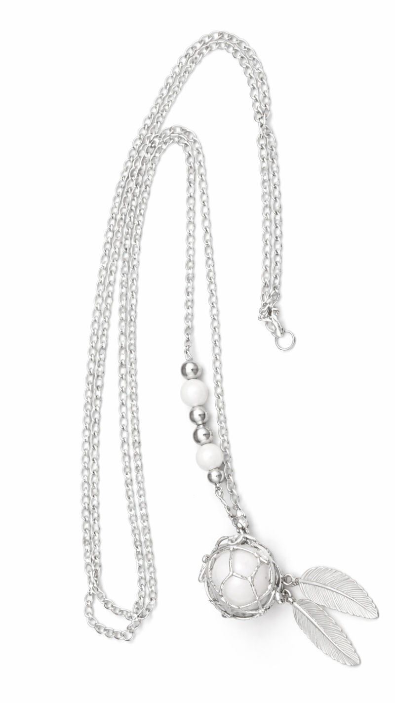 Son long sautoir de 105 cm en argent plaqué haute qualité (10 microns) permet au bola de reposer parfaitement sur le ventre, afin que bébé puisse s’habituer à ce son apaisant tout au long de la grossesse.